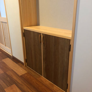 廊下の収納棚、扉は造作です。